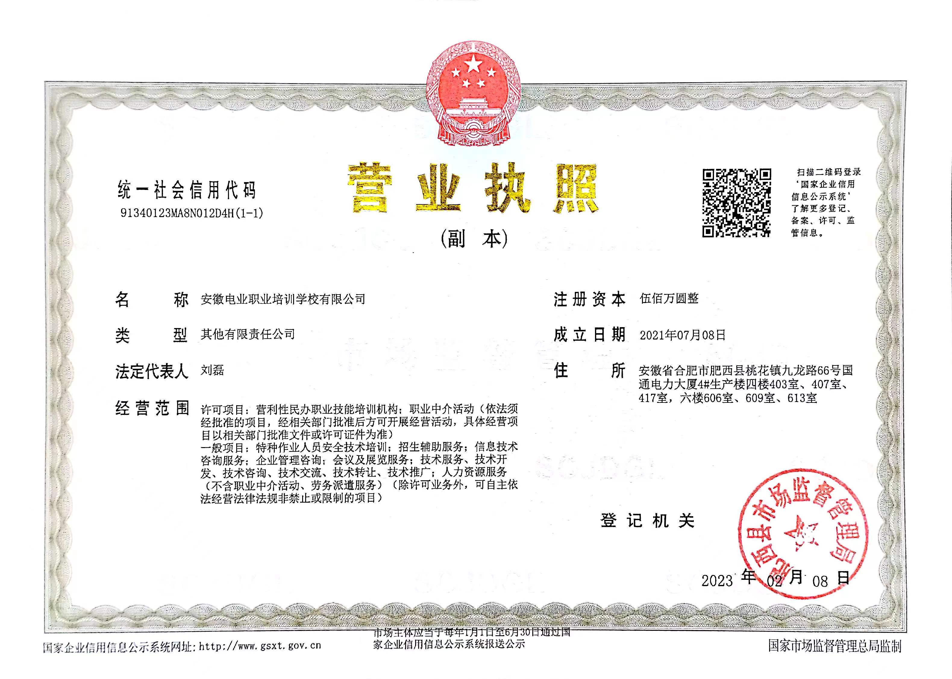 安徽电业职业培训学校有限公司成立于2021年7月1日,是经行政主管部门批准成立的职业培训机构。学校位于安徽省合肥市经开区九龙路66号国通电力大厦2楼,毗邻合肥大学城,交通条件便利,教育氛围浓厚。学校办公教学场所面积约1500平方米,教学设施完善,功能齐全,建有标准化电教室、教室、各类实训室。拥有一支理论知识强、技能水平高、教学经验足的师资队伍。